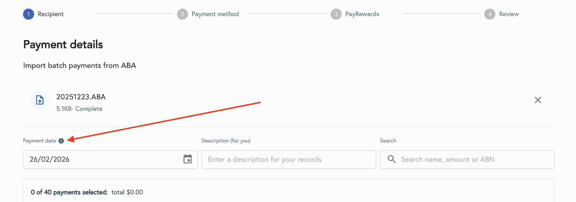 Note: If your ABA file includes a payment date from your accounting software, our platform will automatically use it. You can change this date if needed to meet processing requirements. - Confirm recipients and payment amounts, and select the checkbox on rows for payments you wish to make, or select all.